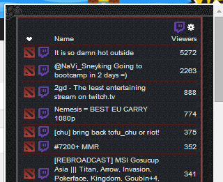 - Dota 2 Stream BrowserTwitch Streaming berkembang semakin pesat setiap harinya. Dota 2 dan LOL merupakan 2 game yang sangat mendominasi di Twitch streaming ini. Dengan menggunakan Chrome extension Twitch Now, maka kamu bisa dengan mudah melihat siapa saja yang sedang melakukan streaming, berapa jumlah penonton, dan tentunya mudah juga kamu menentukan game yang sedang ramai di streaming. Tidak perlu membuka Twitch terus-menerus, cukup install extensionnya dan kamu akan mendapatkan live update streaming Twicth.